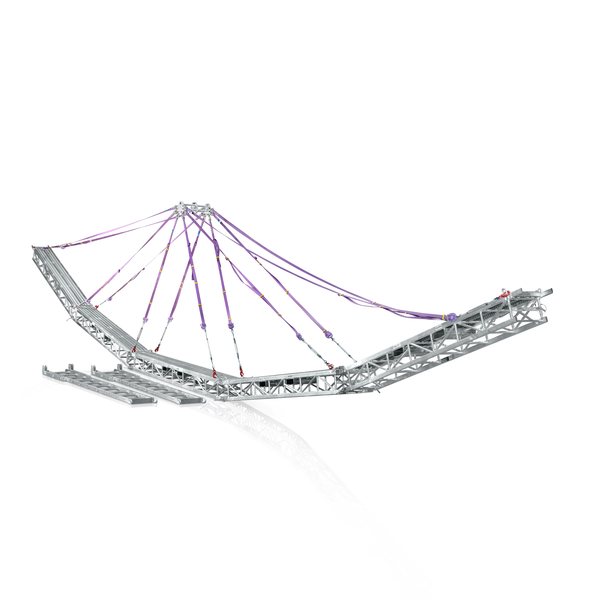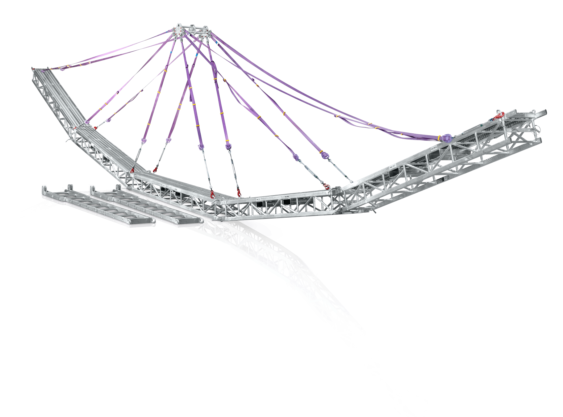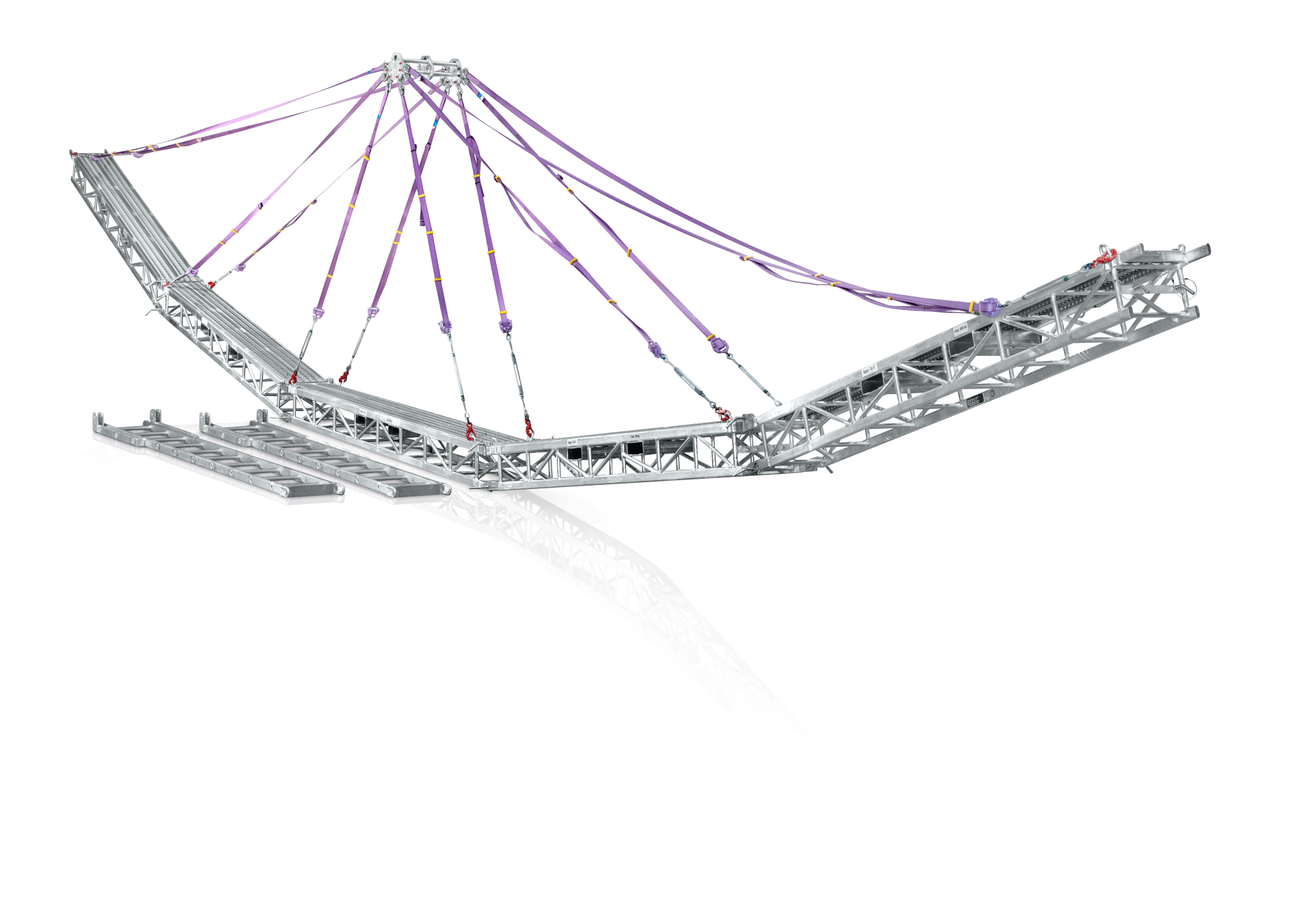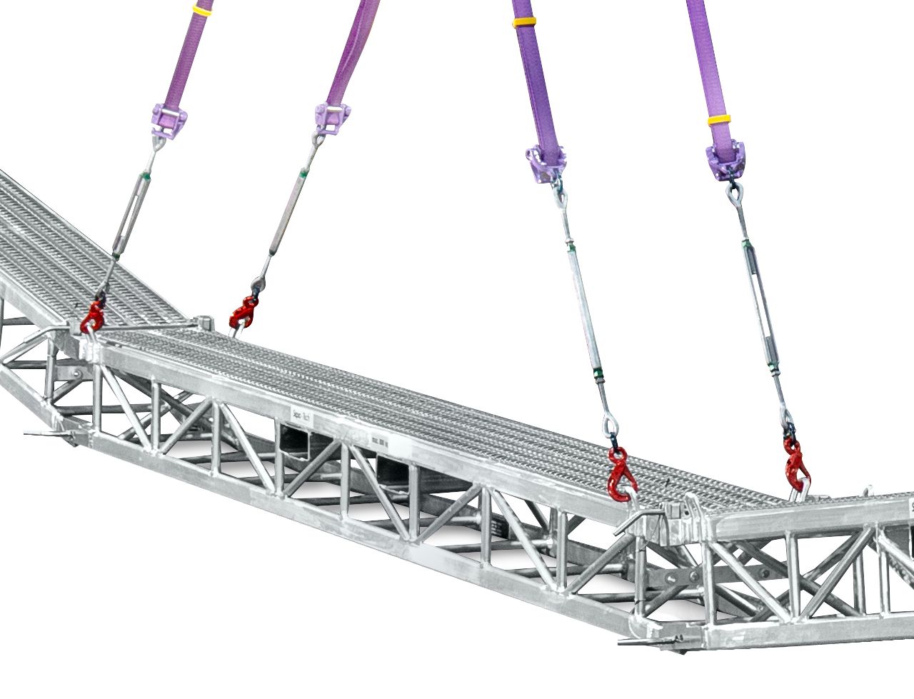 - Das vormontierte Bühnen-Gehänge mit Hebegurten wird in einer Transportbox mitgeliefert